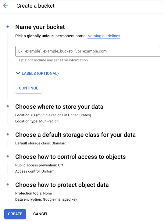 Next, you’d optionally create a Google Cloud Storage bucket to store the artifacts produced during the experimentation process. This can also be done using a few clicks from the GUI: