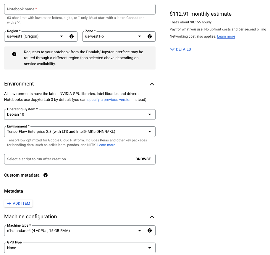 To run experiments that need to go beyond your local machine, you’d typically start by spinning up a notebook instance. You'll likely use Vertex AI Workbenches if you’re on GCP, and it provides various options to customize your notebook instance to your specification: